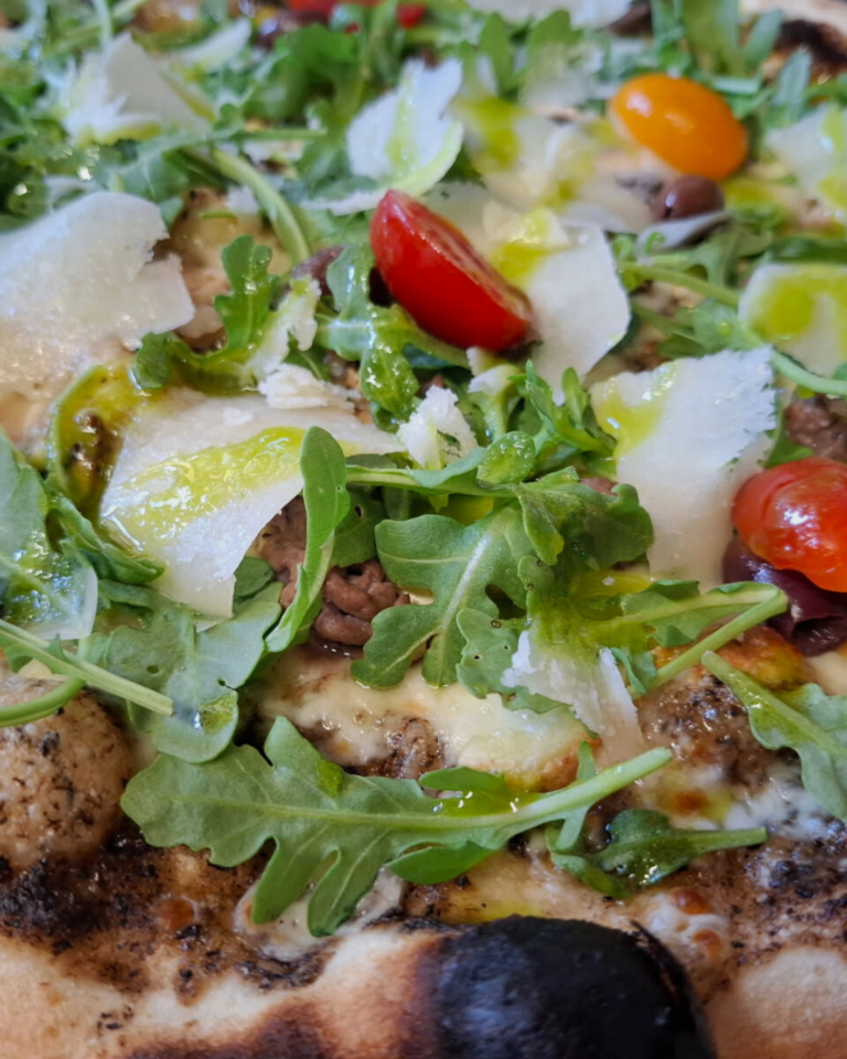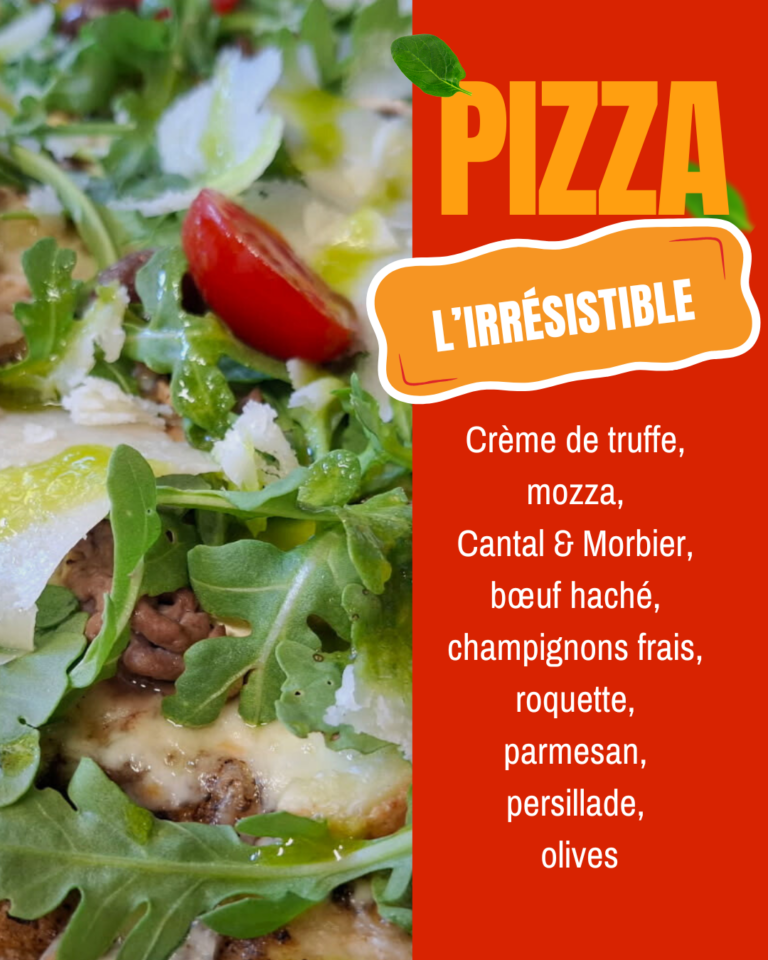 Au menu : crème de truffe onctueuse, mozza fondante, Cantal & Morbier, bœuf haché savoureux, champignons frais, roquette fraîche, parmesan, persillade, olives